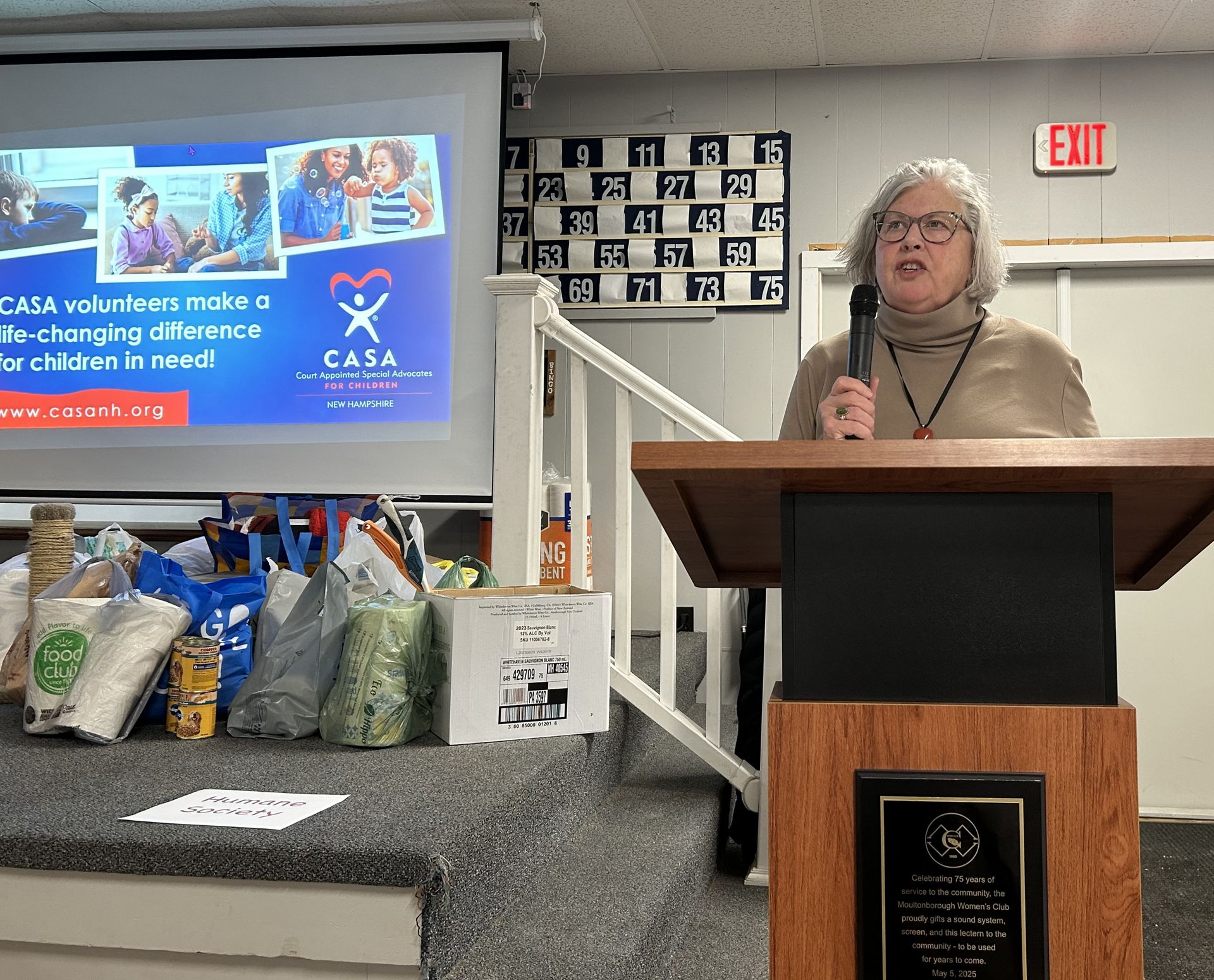 At the January 5 Moultonborough Women's Club meeting, staff and volunteers, including MWC members Tina Middlebrook and Susan , from CASA of N.H. (Court Appointed Special Advocates) explained the role of court advocates for abused and neglected kids. Extensively trained and highly respected by judges in District and Family Courts statewide, each CASA volunteer becomes the voice in that court for a child seeking a safe and permanent home. Currently 38 CASA of N.H. volunteers cover 40 cases, serving 64 N.H. children.