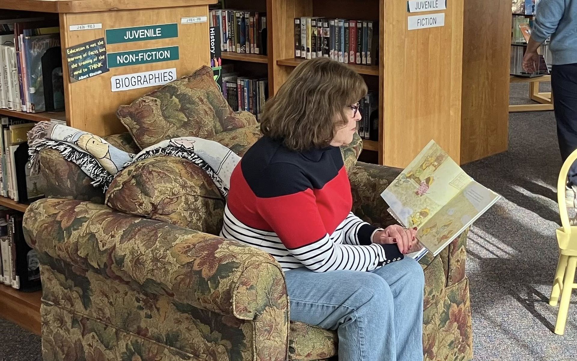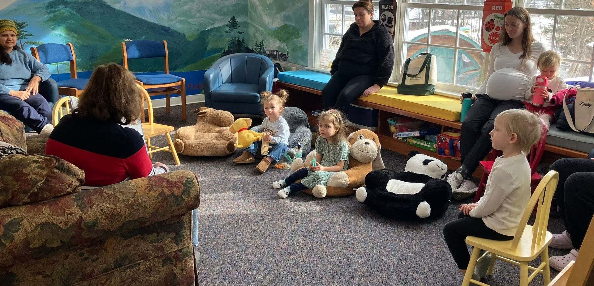 MWC member, Nancy Hill, reads to the children during Story Time at the Moultonborough Library.